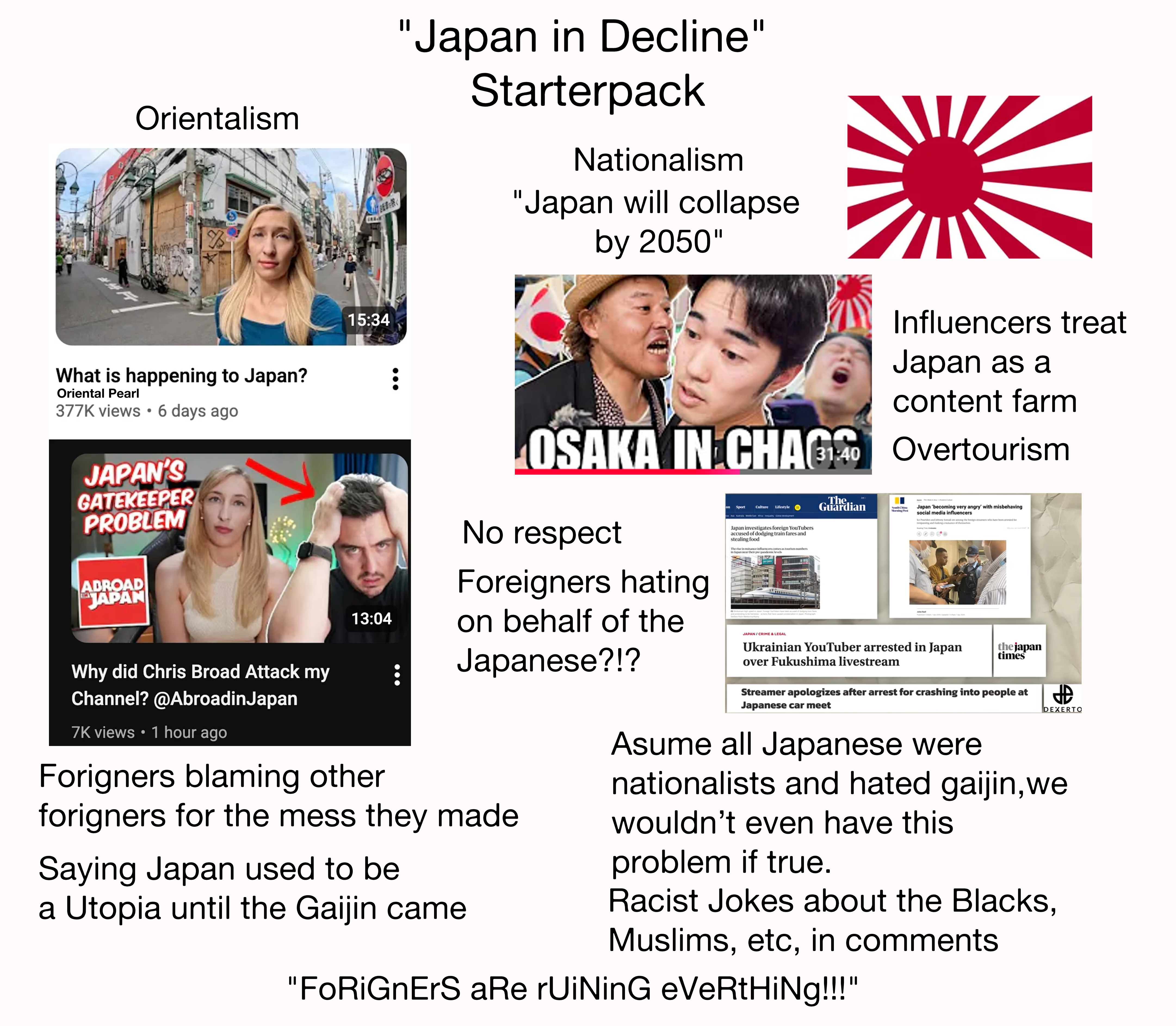「Japan in Decline Starterpack」の画像には、「外国人が日本を壊している!!!」「日本人は全員ナショナリストで外国人嫌いだと思っている」といった要素も含まれていました。これらのコメントに対して、Redditユーザーたちは鋭い批判を向けました。