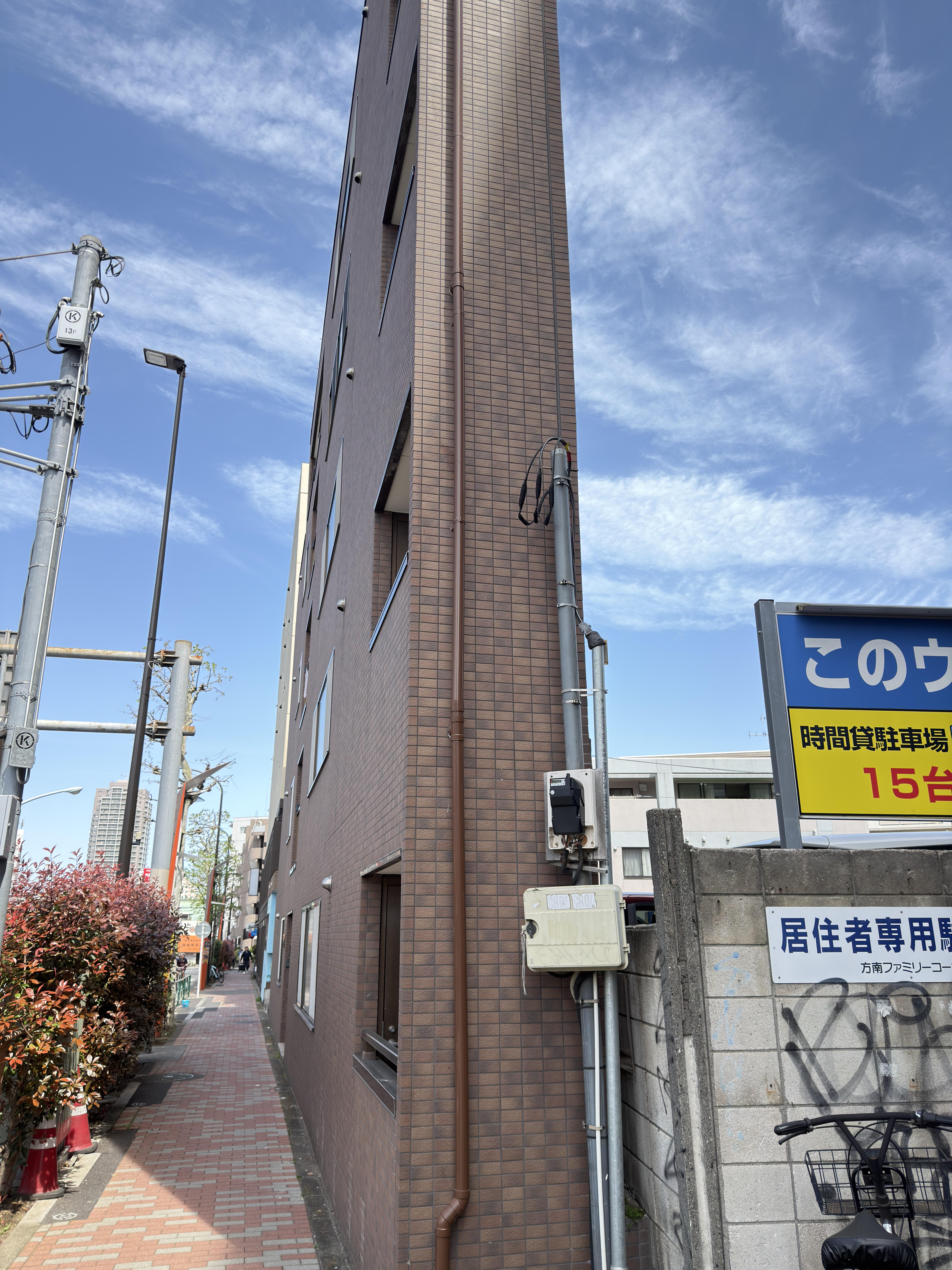 典型的な東京のスペース効率だね。日本に住んでいるけど、いまだにこういうのを見ると驚かされるよ。隣にある「駐車場15台」の看板が笑える——駐車場の方が建物より広いんじゃないか。 — LoFiCitySoundShop